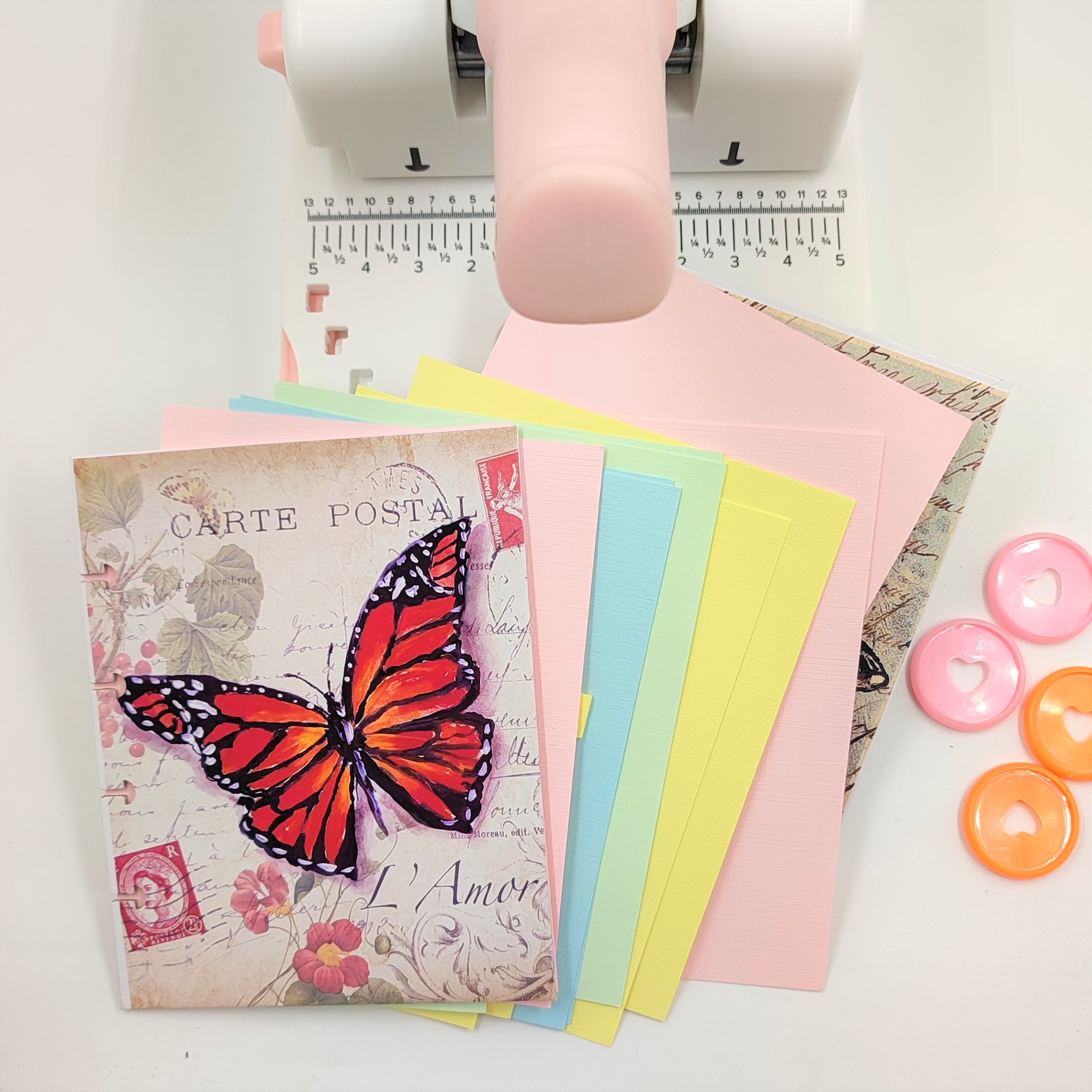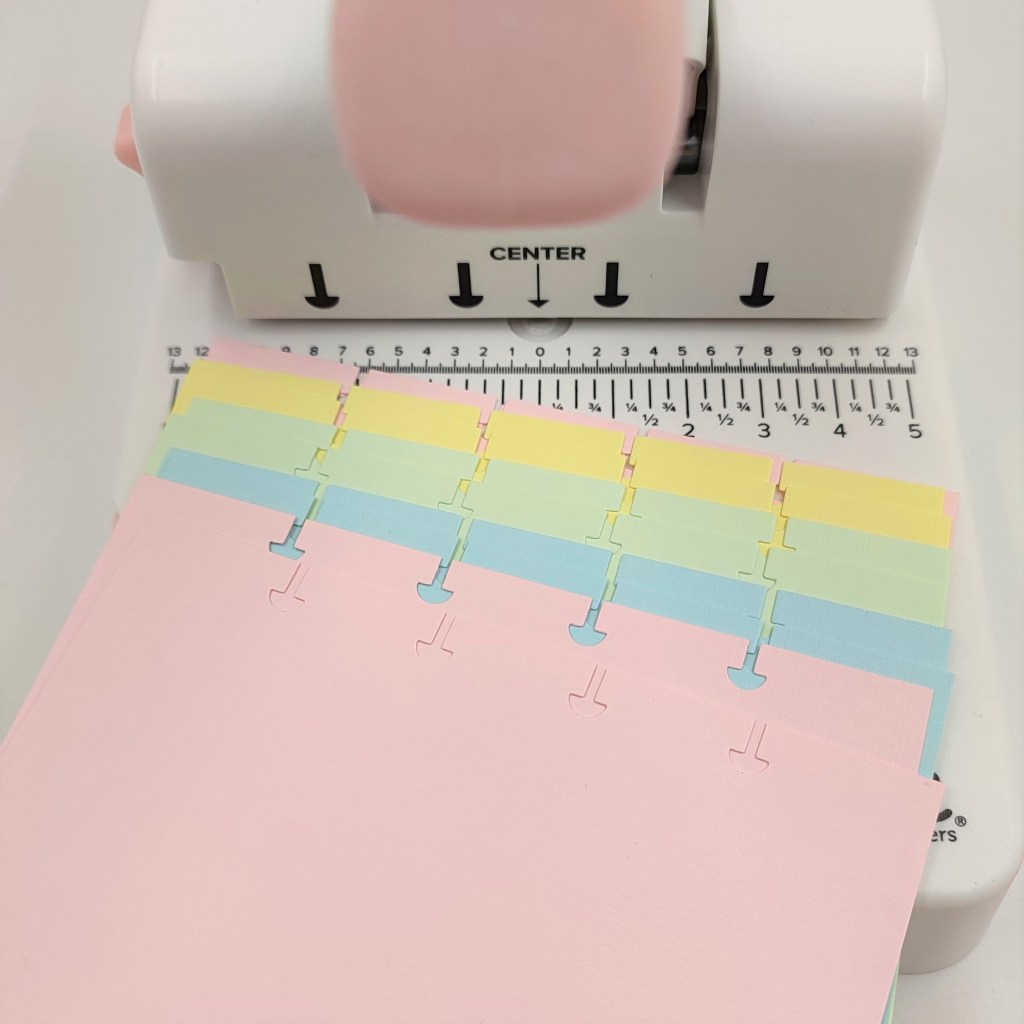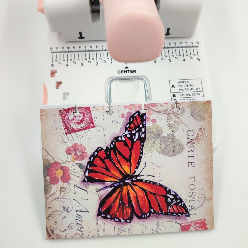 Al igual que la encuadernación normal una vez listas las hojas y las portadas, debemos perforarlas, para mi la maquína perfecta es la Disc Cinch de We R Memory Keepers, la cual realiza los troquelados de forma de «HONGUITOS 🍄».