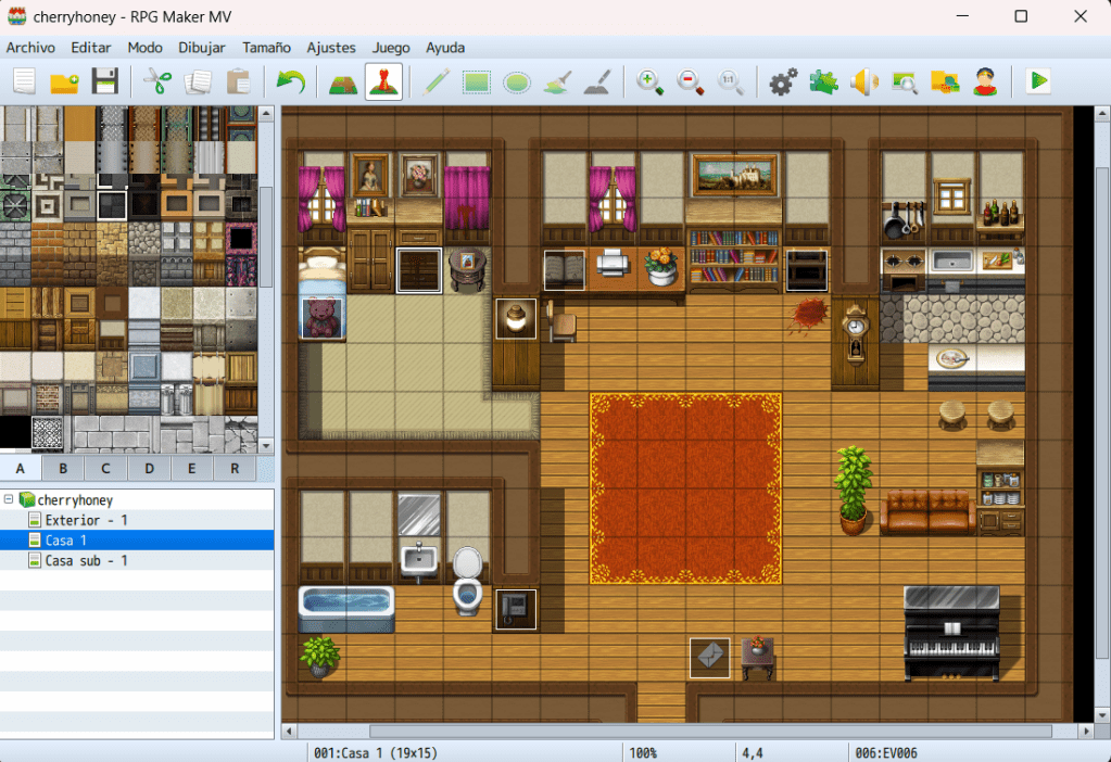 Como fanáticos de los juegos de horror en rpg maker no pudimos dejar pasar la oportunidad de probar el RPG Maker MV, me llevó un par de horas poder entender y realizar distintos eventos, es muy fácil una vez que comprendes la mecánica. Comenzamos creando a modo de ejemplo un mapa del exterior de una casa (Exterior -1) en el cual podemos examinar una tumba, ir al patio trasero el cual está cerrado o entrar a la casa (Casa 1).