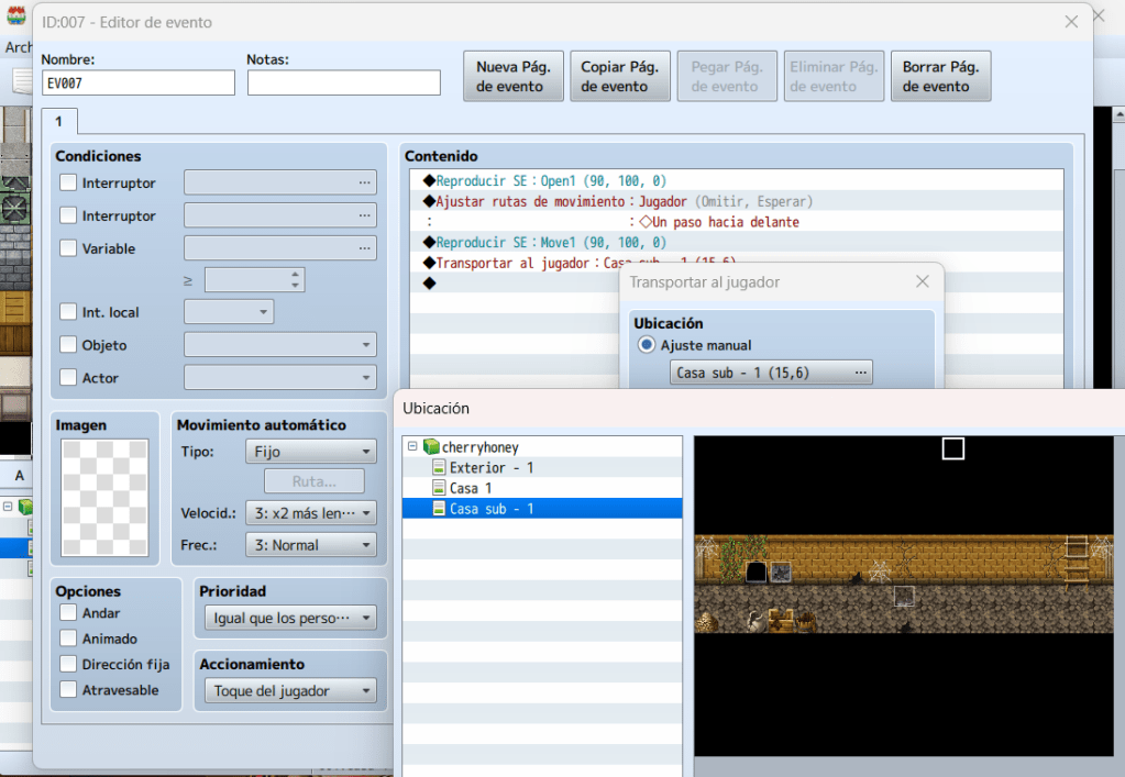 Para ingresar a otro mapa o en este caso al subterráneo de la casa, el evento es llamado de la siguiente manera: