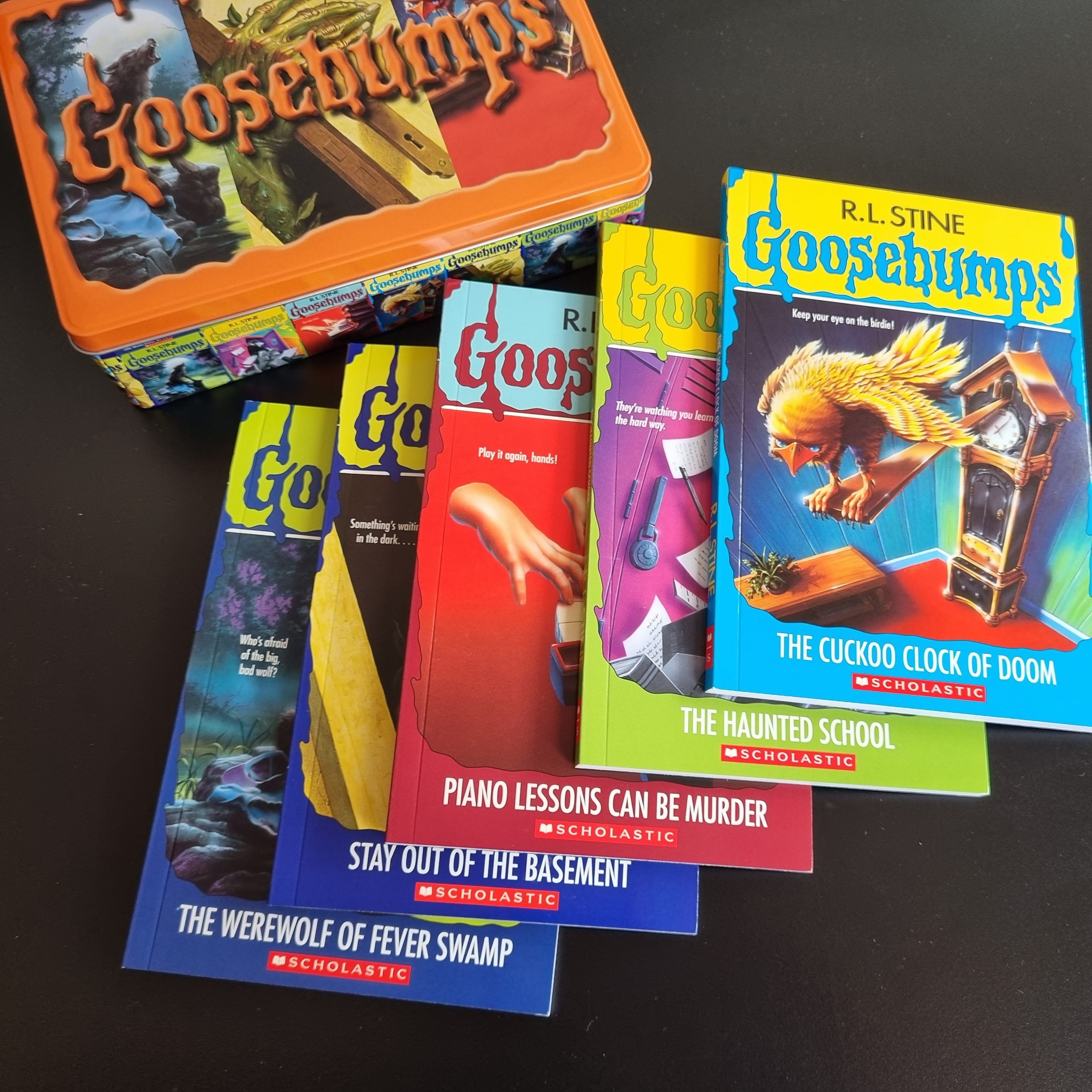 Hace un par de años sacaron a la venta una colección llamada «Goosebumps Retro Fear Set: Limited Edition» de la editorial Scholastic Inc., en la que contiene 5 bestsellers de todos los tiempos, solo pude encontrarlos en inglés pero valió la pena. La colección que escogí contiene; «Stay Out of the Basement», «The Werewolf of the fever swamp», «The Haunted School», «Piano Lessons Can Be Murder», «The Cuckoo Clock of Doom». Puedes comprarlo en Buscalibre y te llega como en 2 semanas a tu casa.