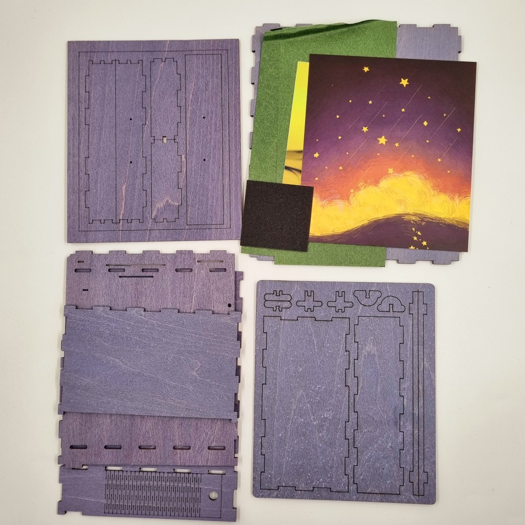 Al abrir la caja nos encontramos con 42 piezas las cuales incluye; el manual de instrucciones, pegamento, pinzas, destornillador, lija, luz, pilas y las bloques de madera pre cortados. A diferencia de los otros que he armado acá no necesitamos pintar, sin esto el armado se agiliza bastante.