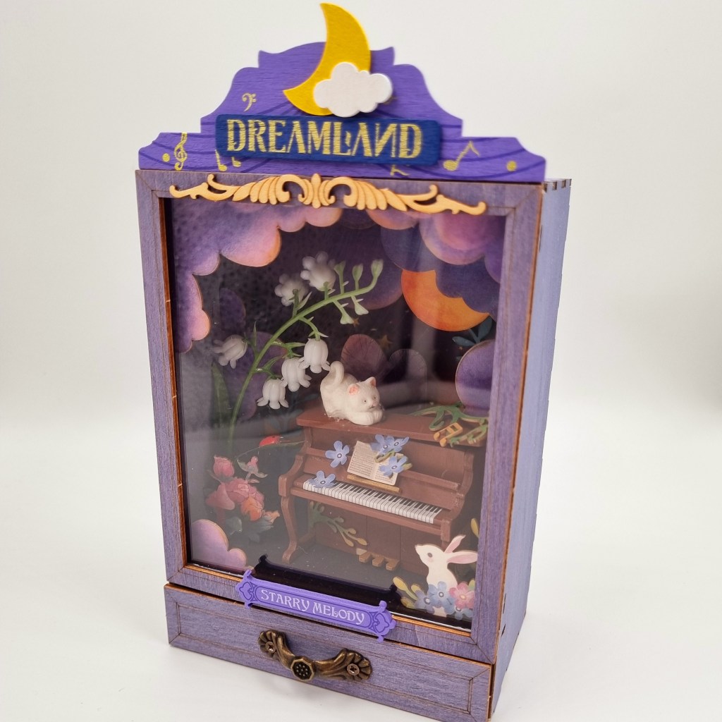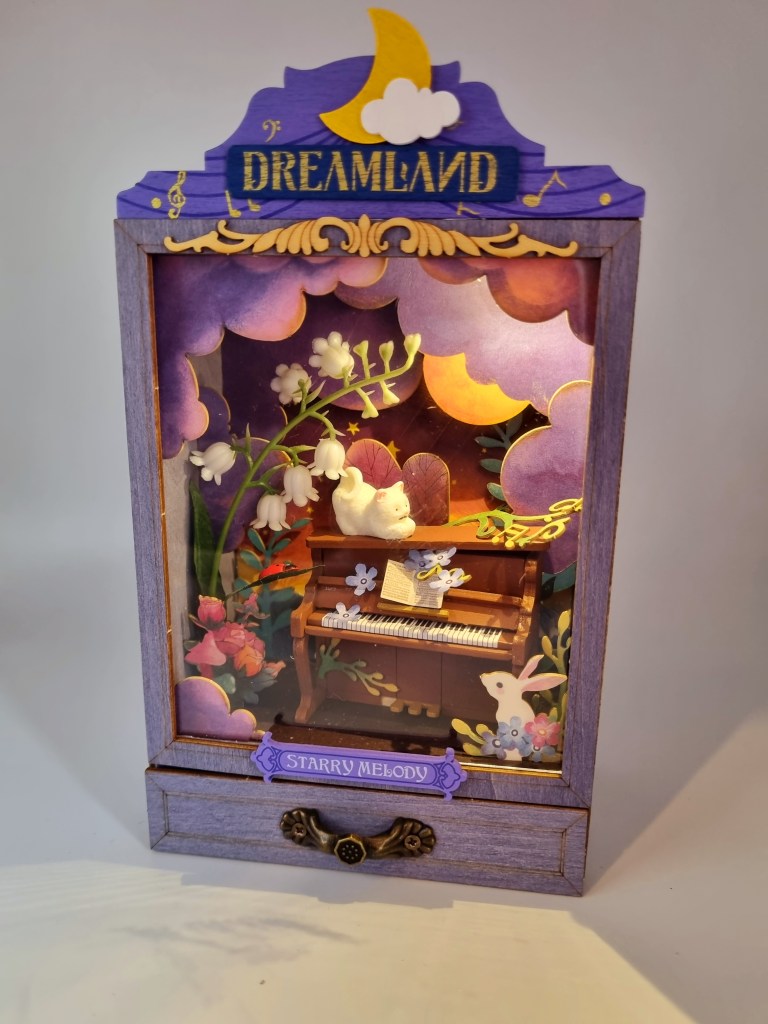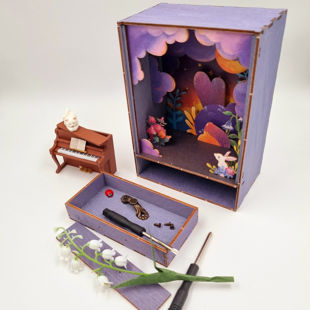 Lo primero que nos indica armar es el piano el cual ya viene pintado y solo debemos pegar sus partes, siguiendo la enumeración es sencillo de identificar y armar, también comenzamos a cortar las piezas troqueladas las cual comenzamos a ensamblar las cuales rápidamente va tomando forma de un hermoso jardín nocturno.