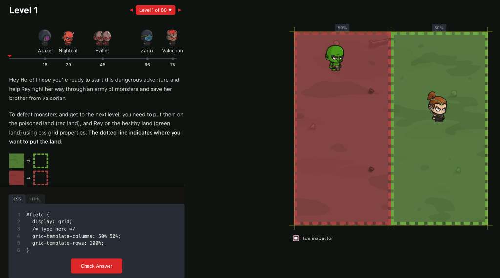 Hace poco tiempo alguién compartió en Linkedin un sitio llamado Coding Fantasy un sitio web que nos permite aprender CSS jugando, sin aburridos videotutoriales ni guías, su premisa es aprender a codear de forma efectiva y revolucionaria, aplicando ejemplos de la vida real y manteniendote motivado para no perder el foco.